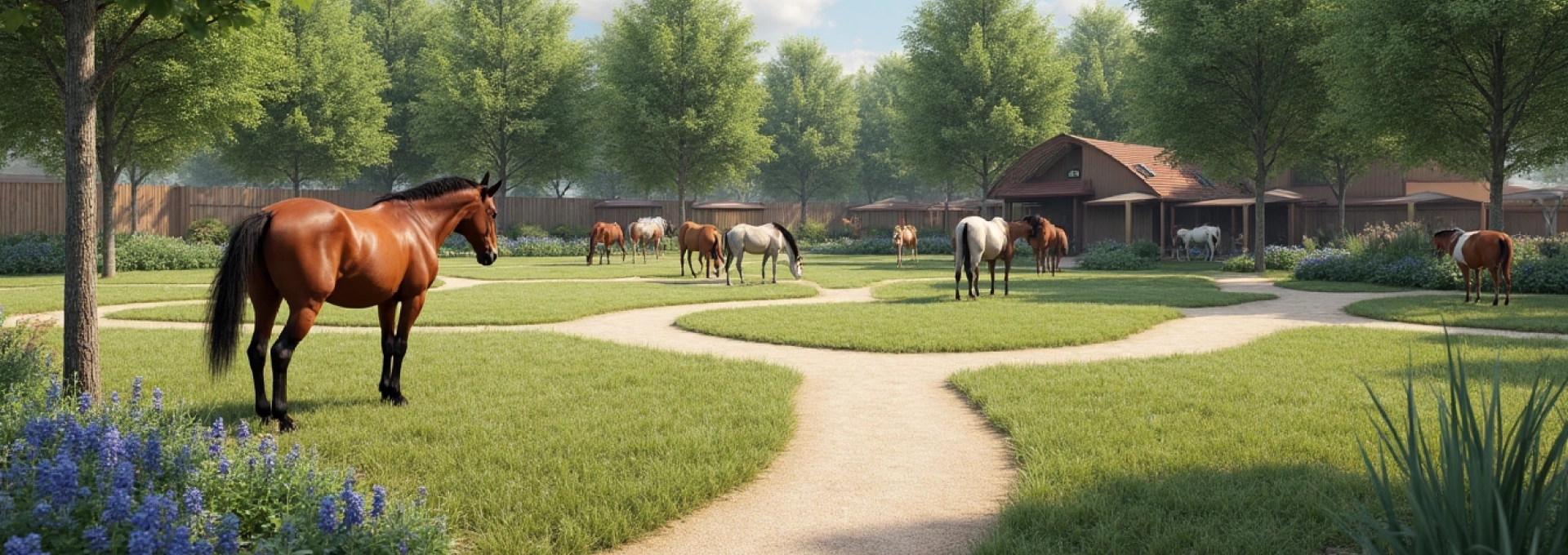 La conception d’un paddock paradise nécessite une réflexion approfondie sur l’utilisation de l’espace disponible. L’agencement doit être pensé de manière à créer un parcours qui incite les chevaux à se déplacer régulièrement entre différents points d’intérêt. Typiquement, un paddock paradise se présente sous forme de pistes ou de couloirs qui serpentent autour ou à travers la propriété, reliant diverses zones fonctionnelles.